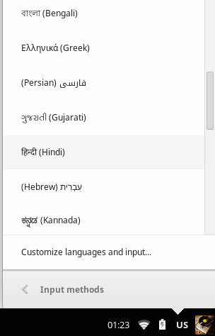 前往 [設定] → [顯示進階設定] → [語言],然後按一下 [語言和輸出設定] 按鈕,再選取您想使用的輸入工具。請注意,標示為 [以母語表示的語言名稱] ([以 Chrome 使用者介面語言表示的語言名稱]) (例如 हिन्दी (北印度文)) 的輸入方法代表輸入工具提供的音譯。音譯工具會將您輸入的內容以目標語言進行音譯。