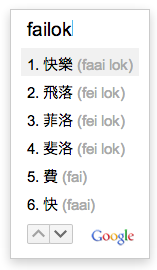 粵語沒有採用廣泛使用的羅馬化方案。在使用這個粵語輸入法編輯器時,您只需輸入該字詞可能的英文拼音,然後輸入法編輯器會試著找出符合該發音的所有字詞。例如,當您輸入「failok」時,系統就會顯示「快樂」。
