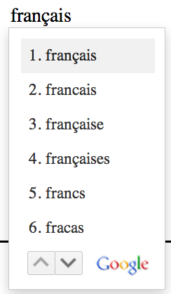 如果連續輸入「francais」,畫面上出現的候選文字就會成為自動音調候選文字。按一下 空白/ENTER 鍵即可提交候選文字「français」。