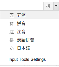 。按一下圖示即可開啟/關閉目前的輸入法編輯器,按一下旁邊的箭頭則可選取其他輸入工具。輸入法編輯器開啟時,按鈕會呈現灰色的狀態