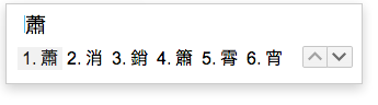 - 使用向左/向右方向鍵瀏覽同一頁內的候選文字清單。