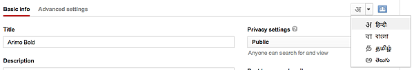 Google 為影片製作者提供了多種印度語音譯工具。私隱圖示旁邊的「अ」圖示代表音譯工具,按一下這個圖示即可使用音譯工具。